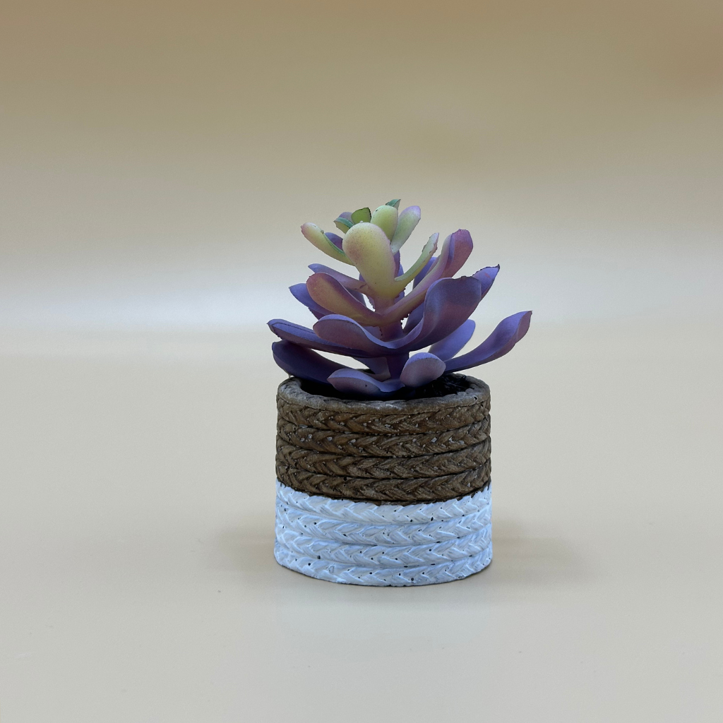 Add a touch of natural charm and rustic elegance to your space with this delightful artificial succulent. Housed in a unique two-tone pot featuring woven rope detailing, this piece offers the beauty of a vibrant succulent without any of the care or maintenance.