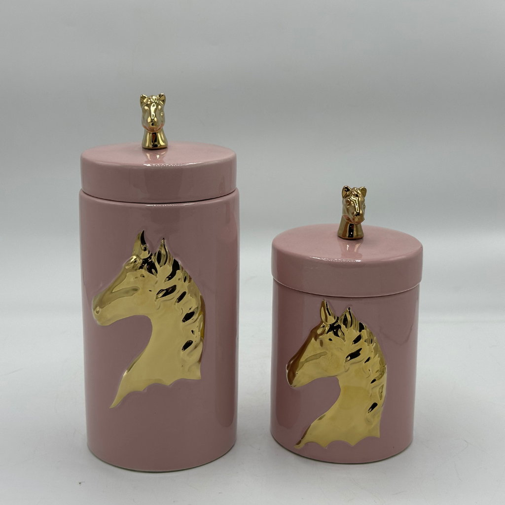 Set of 2 Elegant Pink Ceramic Decorative Jar with Sculpted Gold Horse Head Accents