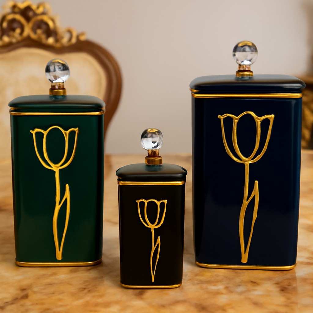 Add a touch of refined beauty to your kitchen or home décor with this elegant ceramic storage jar. Featuring a stylish tulip design in a striking gold outline, this square jar is accented with delicate gold trim and topped with a sophisticated crystal knob on the lid. Perfect for storing kitchen essentials, bathroom supplies, or simply as a chic decorative canister.
