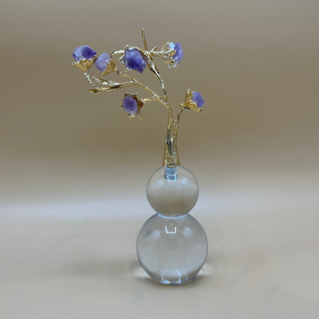 - Raw Amethyst Crystal Flowers: Adorned with natural amethyst crystal pieces, giving the appearance of unique, blossoming flowers with beautiful purple tones.