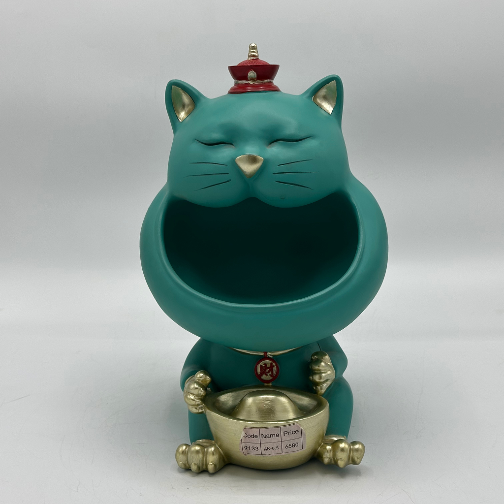 Invite good fortune and charming organization into your space with this delightful Maneki-neko (lucky cat) figurine. Holding a golden ingot, this cat features an open mouth area perfect for storing small items or displaying decorative pieces. Available in serene white or calming teal.