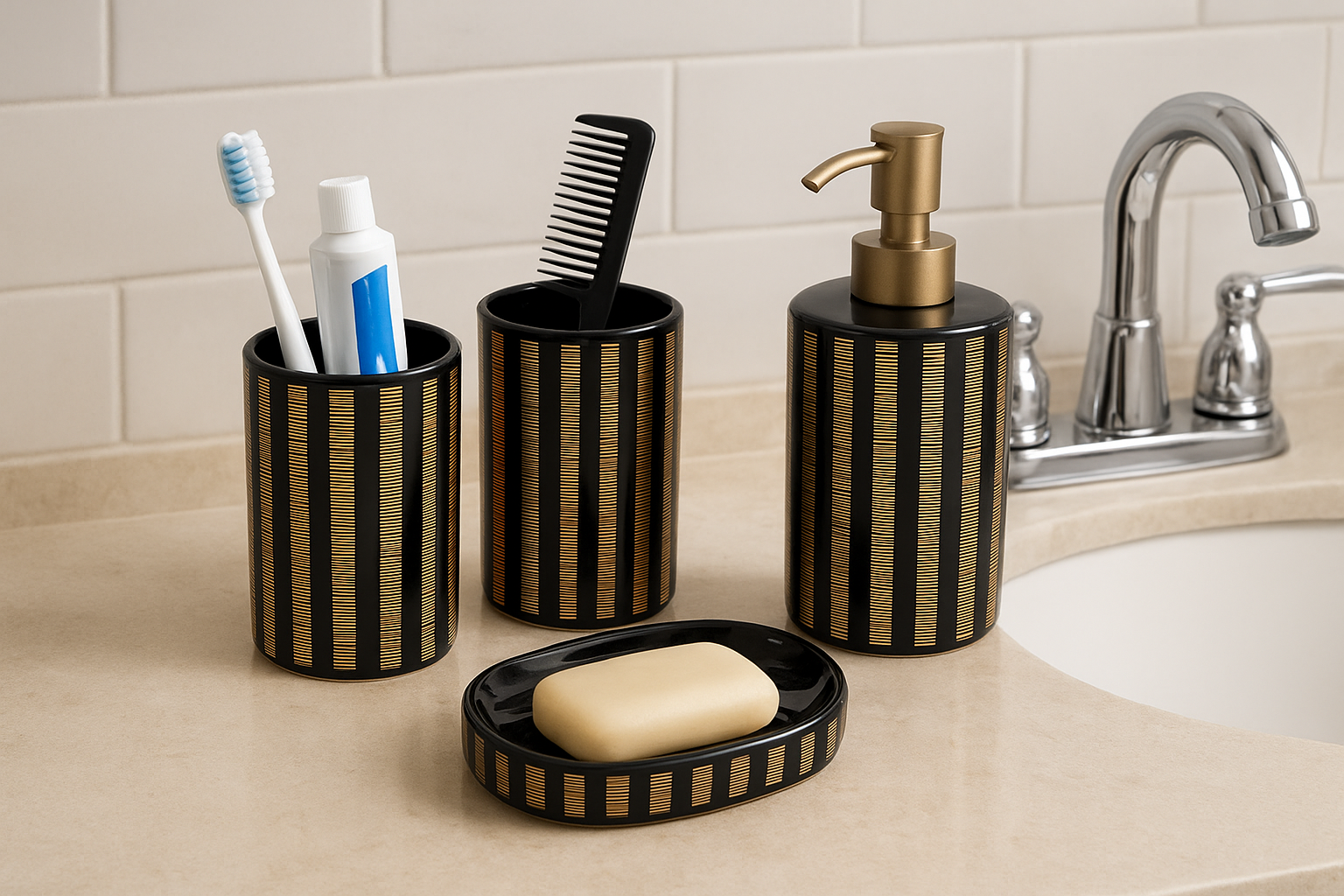 Add a luxurious touch to your bathroom with this Washroom Accessories Set of 4 featuring a bold black base with elegant golden stripes. This set is designed to combine modern style with practical functionality, making it a perfect upgrade for any bathroom.