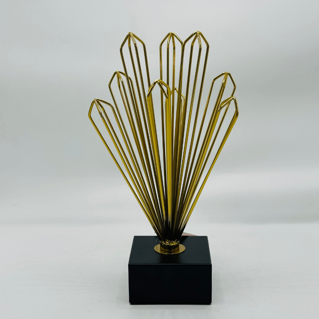Add a touch of contemporary elegance to your home or office with this striking gold wire fan sculpture. Featuring a series of sleek, elongated gold wires fanning out from a central point and mounted on a solid black square base, this abstract ornament creates a dynamic and eye-catching visual display. The rich gold finish contrasts beautifully with the matte black base, adding a touch of sophistication and modern style to any space.