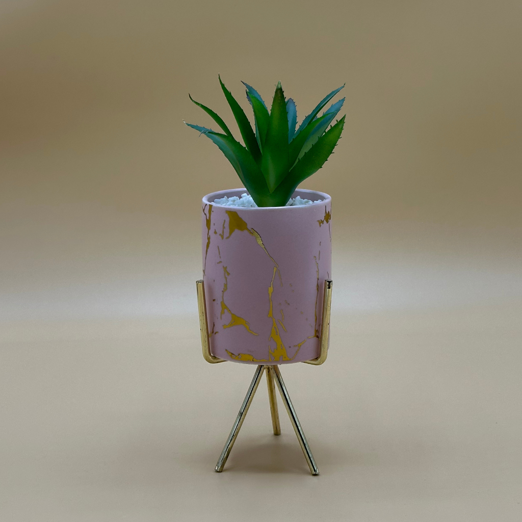 Elevate your indoor greenery with this chic and modern planter. Featuring a beautiful pink pot with gold marble-like veining, it sits gracefully on a sleek golden metal stand. Comes complete with a realistic artificial succulent, adding a touch of sophisticated greenery to any space.
