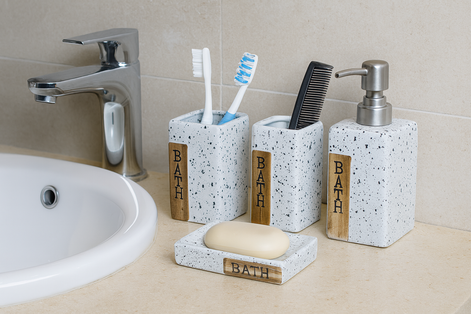 Give your bathroom a modern and natural touch with this Washroom Accessories Set of 4 featuring a stone-style speckled finish and wooden “BATH” label. A perfect combination of style and practicality for daily use.