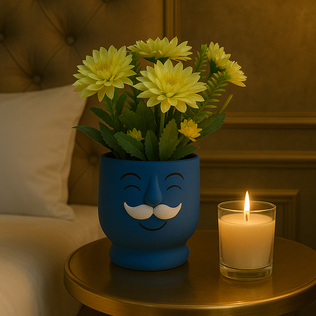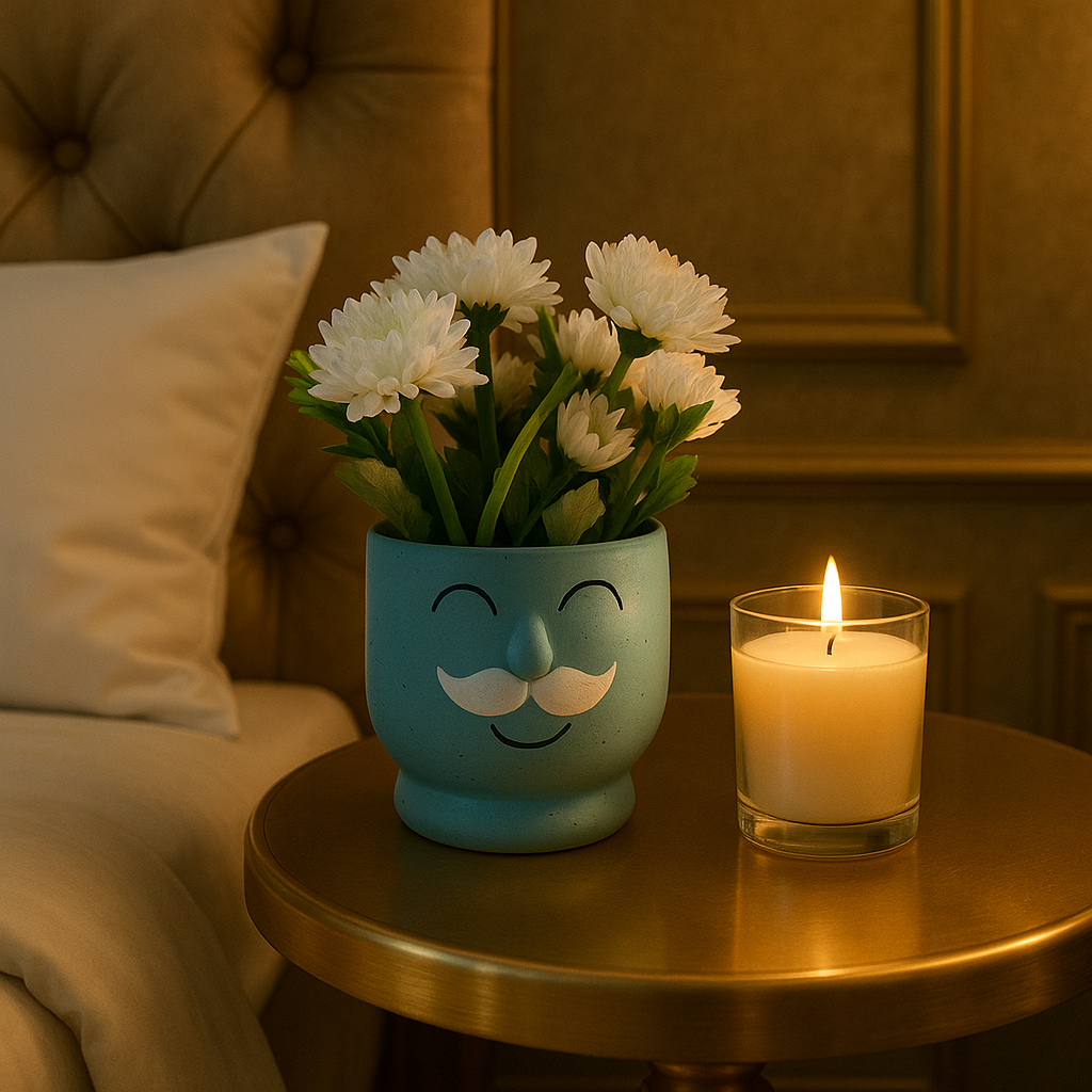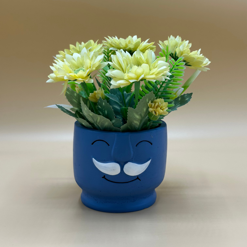Add a touch of playful charm and cheerful greenery to any space with this whimsical artificial floral arrangement. It features vibrant white faux flowers and lush green foliage nestled in a unique and adorable teal-colored pot designed as a smiling face with a distinct white mustache. This delightful piece brings personality and a pop of color to desks, shelves, windowsills, or any corner needing a cheerful accent. Enjoy the beauty of flowers and the fun of a character pot with absolutely no maintenance required.